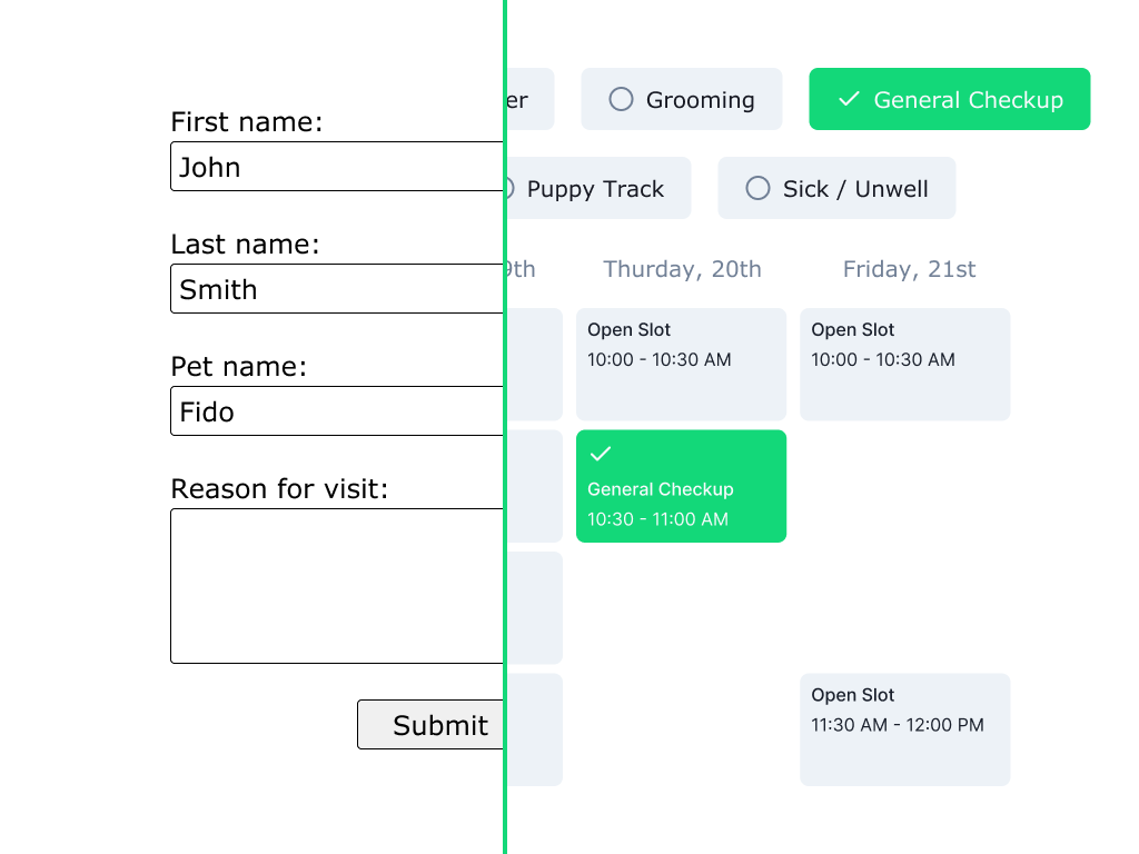 Fully customizable & fully integrated with your PIMS. Offer your clients an easier & more convenient way to book appointments while maintaining complete control over your schedule.