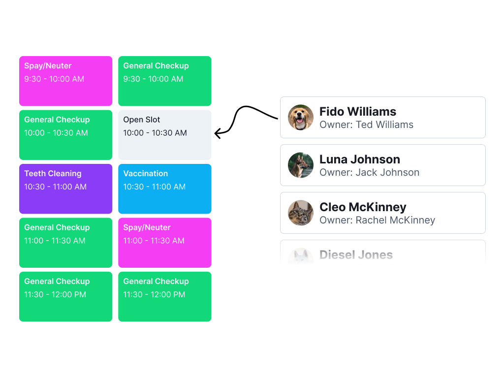 Fully customizable & fully integrated with your PIMS. Offer your clients an easier & more convenient way to book appointments while maintaining complete control over your schedule.